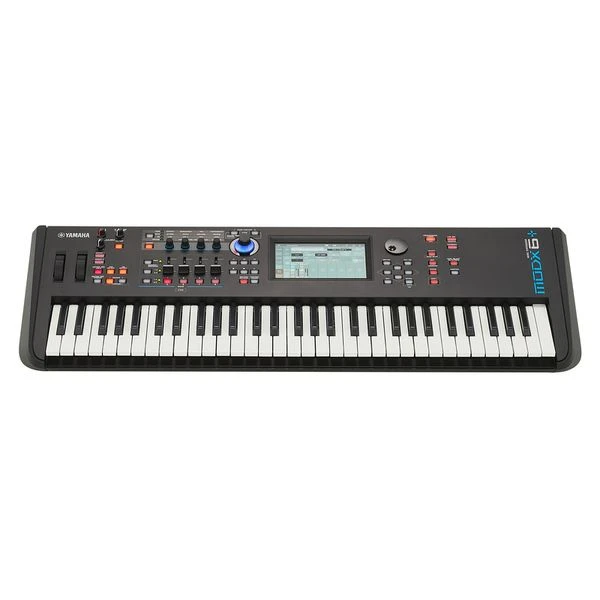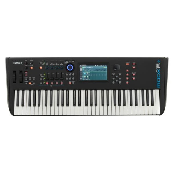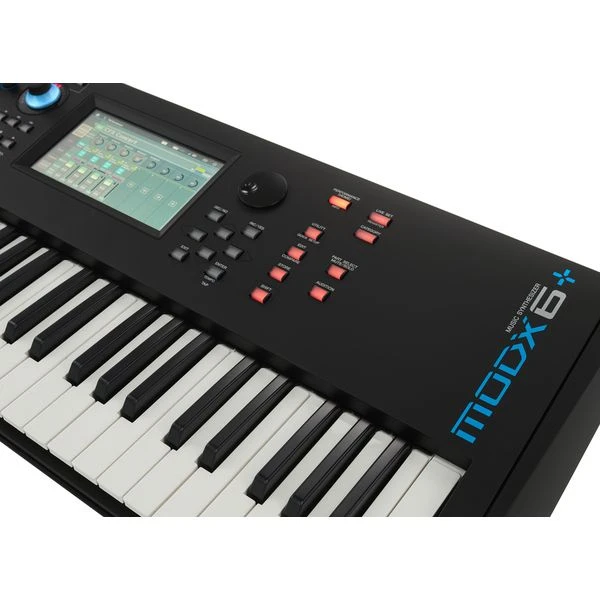 Yamaha MODX6+; compact music synthesizer with 61 keys; semi-weighted keyboard (velocity sensitive); motion control synthesis; sample-based AWM2 synthesis with 128 voices; 5.67 GB waveform ROM + 1.75 GB flash ROM for user waveforms; FM-X synthesis with 128 voices; 8 operators and 88 algorithms; integrated effects, Part-EQ, Master-EQ, 2.227 preset performances (up to 16 parts per performance for splits, layers, MIDI multimode); Super Knob controls up to 128 parameters simultaneously; 7-inch colour VGA touch screen; 4 rotary controllers; 4 faders; integrated 4/10 USB audio interface for PC/Mac/iOS; connections: 2x line input 6.3 mm jack, 2x line output 6.3 mm jack, stereo headphone output 6.3 mm jack, USB host and device connections, MIDI I/O, 2x pedal input; 2x footswitch input; external power supply 12V DC; incl. Steinberg Cubase AI DAW software for PC/Mac; dimensions: 937 × 331 × 134 mm; weight: 6.6 kg; suitable Cover: Art. 486652, 493056 (not included); suitable case: Art. 497939 (not included)
